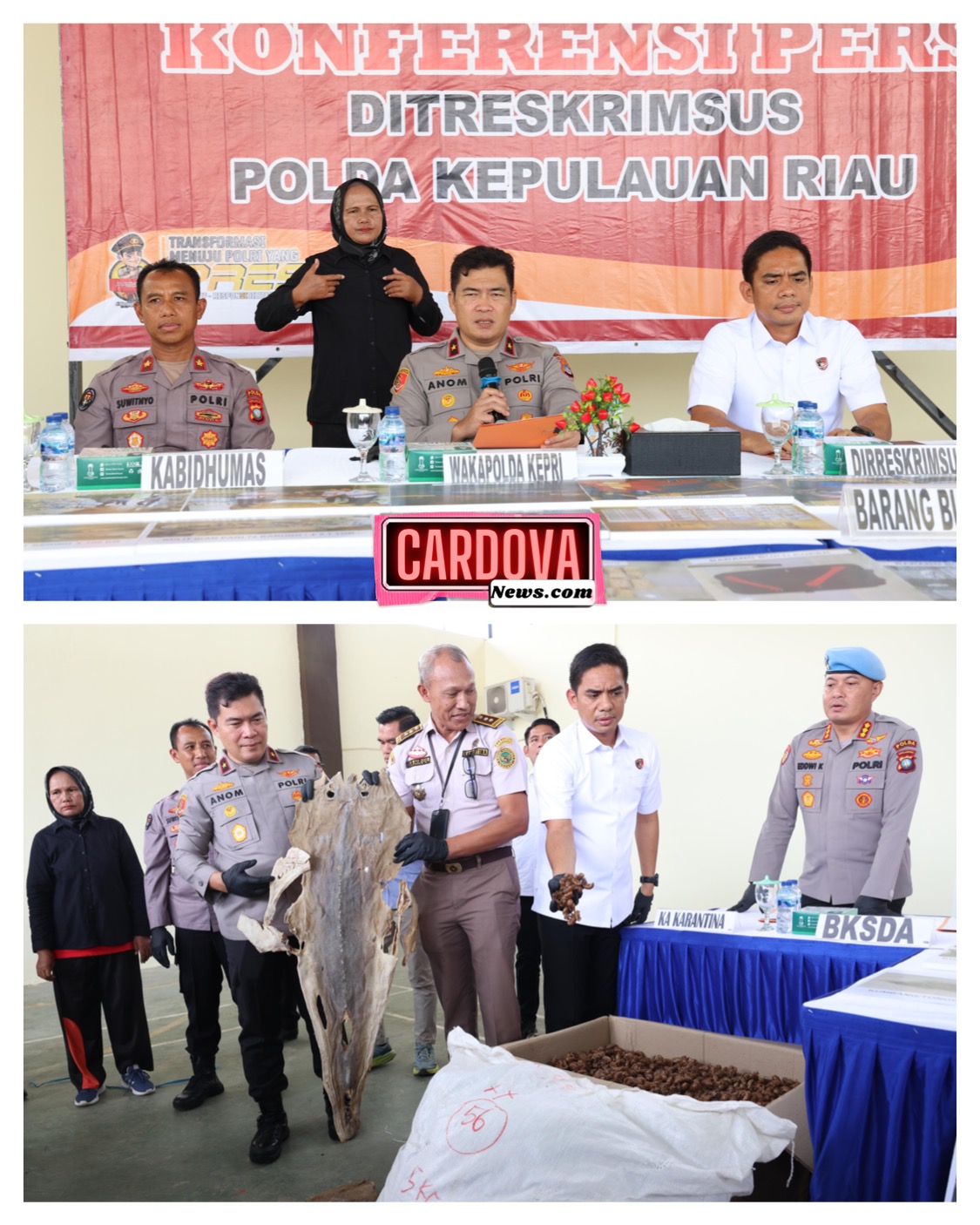 Cardovanews.com – Batam – Wakapolda Kepri Brigjen. Pol. Dr. Anom Wibowo, S.I.K., M.Si., memimpin langsung konferensi pers pengungkapan sejumlah kasus menonjol yang berhasil ditangani Ditreskrimsus Polda Kepri. Kasus-kasus tersebut meliputi tindak pidana penyalahgunaan BBM subsidi, tindak pidana pelayaran terkait pengangkutan BBM tanpa izin, tindak pidana konservasi sumber daya alam hayati berupa perdagangan dan penyelundupan satwa dilindungi, serta tindak pidana karantina hasil laut yang hendak diselundupkan ke luar negeri. Kamis (21/8/2025).